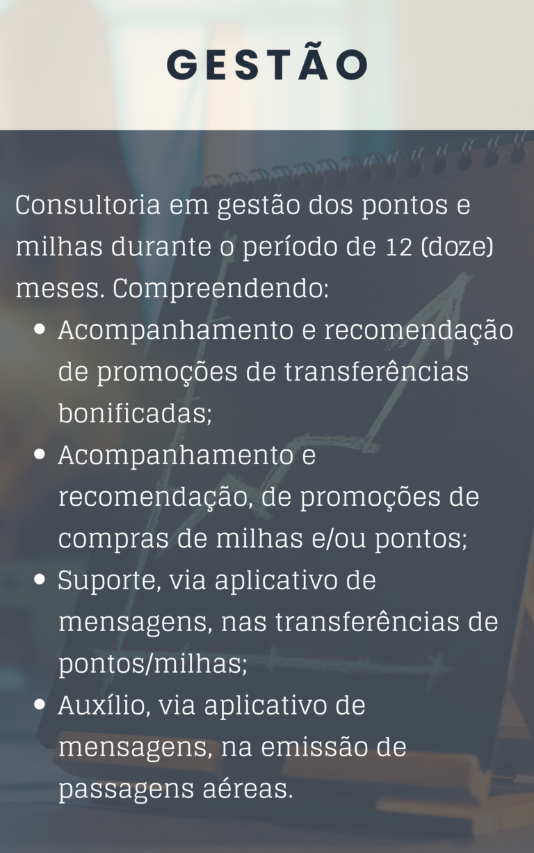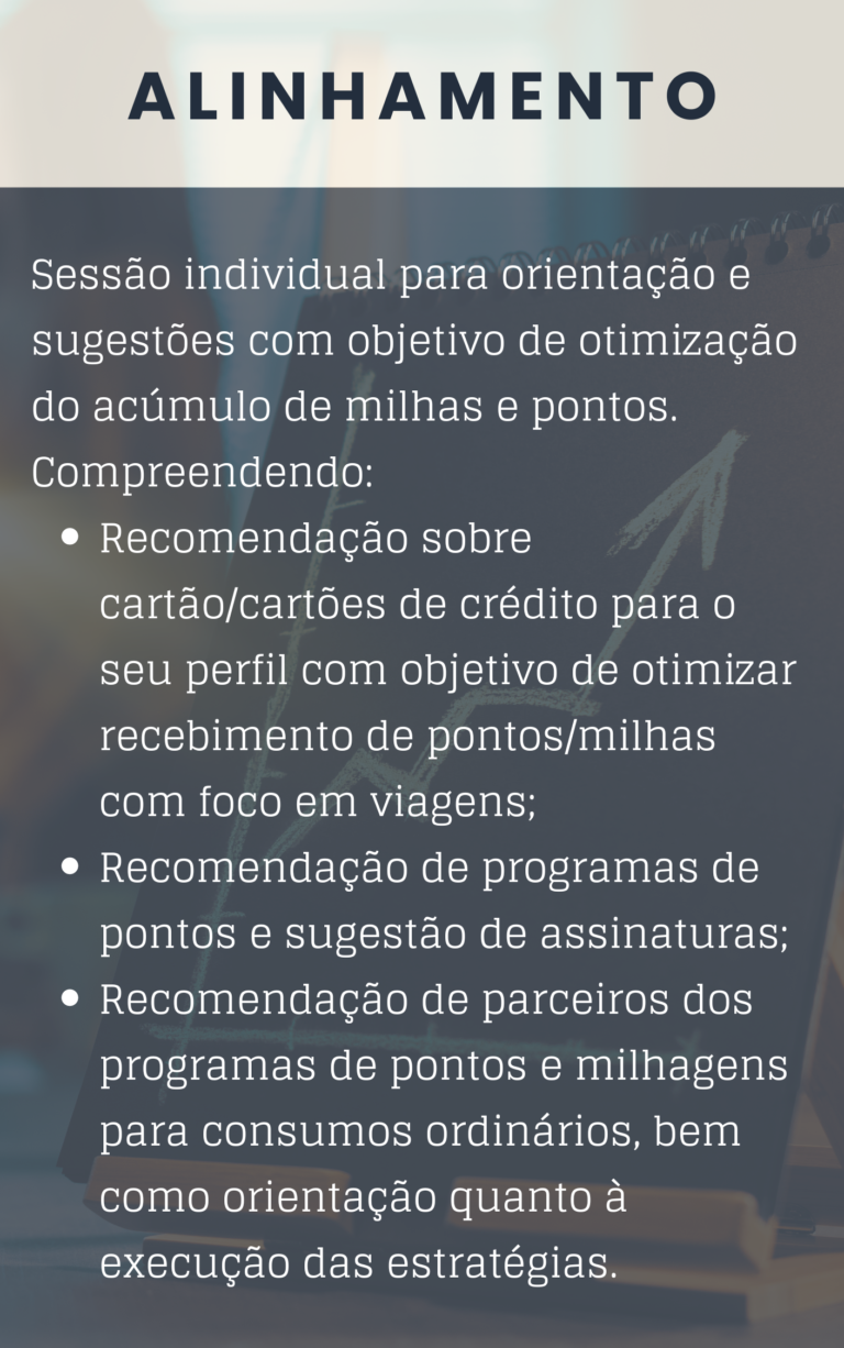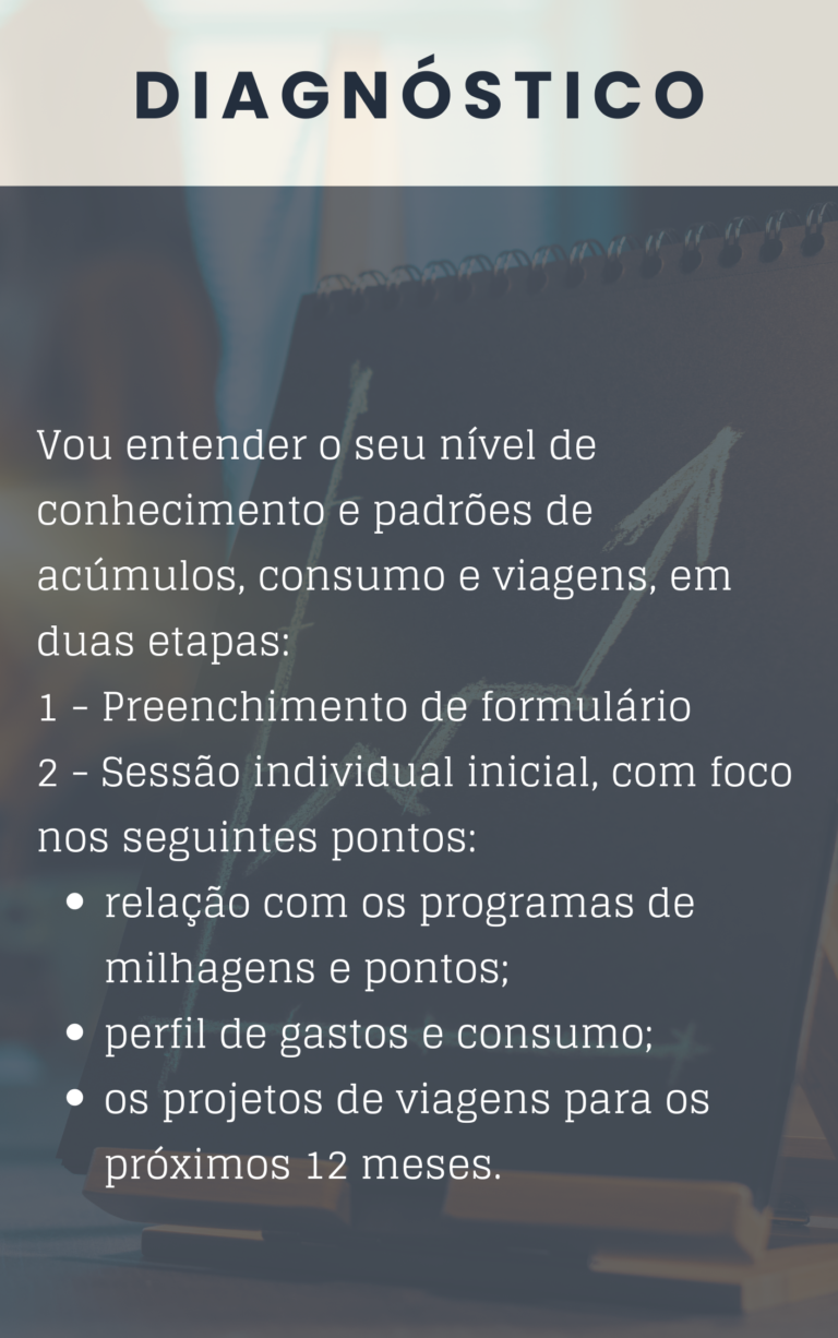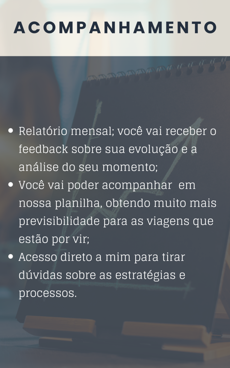 Após conhecer o seu perfil de consumo e desejos de viagens, estarei diretamente com você durante 12 meses, auxiliando na otimização os seus ganhos e na forma como utiliza pontos e milhas, com foco não só no aumento da frequência de viagens, como também na maximização dos benefícios associados aos diversos programas.